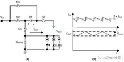 白光LED通常由一個恒定直流電流源驅(qū)動,以保持恒定的亮度。在采用單顆鋰離子電池供電的便攜式應(yīng)用中,白光LED以及電流源上的電壓降之總和可以比電池電壓更高或更低,這意味著白光LED某些時候需要對電池電壓進(jìn)行升壓。完成這樣應(yīng)用的最好辦法是使用升壓DC-DC轉(zhuǎn)換器。這種方法可以大大地優(yōu)化效率,但代價(jià)是成本和PCB面積增加。另外一種提升電池電壓的方法是使用電荷泵,也稱為開關(guān)電容轉(zhuǎn)換器。本文將詳細(xì)地分析這種器件的工作原理。