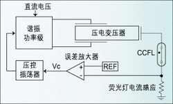 圖4給出了一個基于PZT的背景光轉(zhuǎn)換器的簡化功能圖。PZT由一個幅度正比于輸入電壓的諧振功率級驅(qū)動,它提供驅(qū)動熒光燈所需要的電壓增益。圍繞著誤差放大器形成了一個控制環(huán),誤差放大器把平均熒光燈電流同參考信號(REF)相比較,以便于對熒光燈的光強度進行調(diào)節(jié)。控制電壓Vc驅(qū)動用來確定諧振功率級的運行頻率的壓控振蕩器(VCO)。