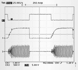 圖6顯示了基于壓電變壓器電路的脈沖調(diào)光波形。一個外部驅(qū)動信號(曲線4)用來給定工作周期和脈沖串的頻率,在本例中,在50%的工作周期脈沖串的頻率為100Hz。曲線1是反饋網(wǎng)絡的COMP引腳的信號,用來設定工作頻率。熒光燈電壓如曲線3所示。這些圖片是使用數(shù)字示波器得到,所以存在混迭現(xiàn)象。熒光燈的激發(fā)電壓幾乎檢測不到,因為燈已經(jīng)是熱的并從前面的脈沖串周期運行過來。
