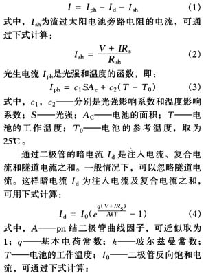 如果在太陽電池兩端接上一個負載電阻RI,那么太陽電池在工作狀態(tài)下的等效電路如圖l所示。它相當于一個電流為J9h的恒流源與一只正向二極管并聯(lián)。流過二極管的正向電流在太陽電池中稱為暗電流Id。Rsh稱為旁路電阻.主要由下列幾種因素引起:如表面沾污而產(chǎn)生的沿著電池邊緣的表面漏電流;沿著位錯微觀裂縫、晶粒間界和晶體缺陷等形成的細小橋路而產(chǎn)生的漏電流。Rs稱為串聯(lián)電阻,系由擴散頂區(qū)的表面電阻、電池的體電阻和上下電極與太陽電池之間的歐姆電阻及金屬導(dǎo)體的電阻構(gòu)成的。