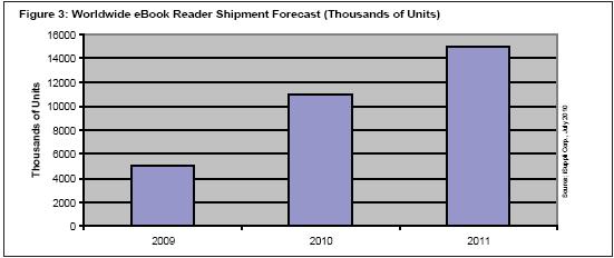 iSuppli公司預測,2010年全球是電子書閱讀器出貨量將增至1100萬個,比2009年的500萬個增長120%,如圖3所示。目前,iSuppli公司無意大幅改變這個短期預測。