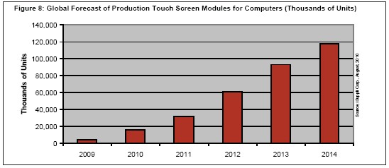 iSuppli公司預測,2014年用于電腦的觸摸屏模組全球產(chǎn)量將大增到1.179億個,而2010年是1580萬個。圖8所示為iSuppli公司對用于電腦觸摸屏全球產(chǎn)量的預測,包括臺式機、移動PC和slate以及平板電腦產(chǎn)品。