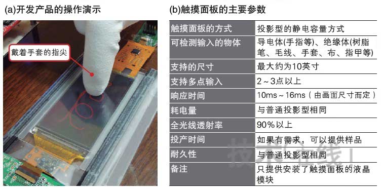 除了可以用絕緣物輸入的特點以外,在具有10ms~16ms的響應時間、90%以上的全光線透射率以及耗電量和耐久性等方面,此次開發的產品與普通的投影型性能相同。在檢測控制方面,可使用原來用于投影型的控制器IC。