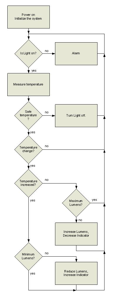當“溫度升高”塊測出溫度升高,便會觸發“最低流明”塊。若流明未達到預設的最低值,則流程導向“降低流明,調亮指示燈”塊。若流明輸出達到預設的最低值,則重新進入“是否開燈?”塊,重新開始檢測序列。