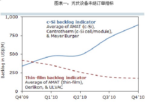 隨著2011年所公布的超越60%年度增長率的產(chǎn)能的擴張,首選設備供應商的訂單使得未結(jié)訂單總量創(chuàng)下新記錄,超過了2008年由高價格交鑰匙薄膜生產(chǎn)線業(yè)務推動的水平。2010年第四季度末,有20家設備供應商的訂單積累已經(jīng)超過了1億美金,這些訂單主要的出貨時間集中在2011年上半年。目前的未結(jié)訂單總量與2009年第四季度相比有26%的增長,導致2010年的訂單出貨比原高于上一年水平(1.24),其中2010年第二季度的更是創(chuàng)下了1.7的八季高點。
