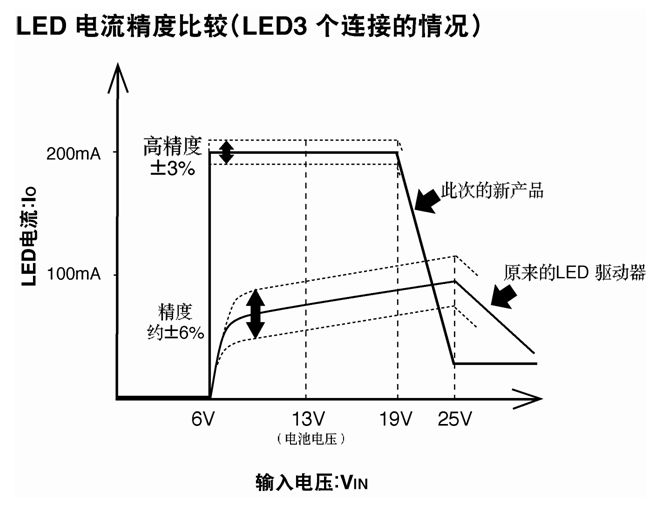 最近,汽車尾燈改裝LED燈的發(fā)展速度驚人,以低耗電量、長壽命這一優(yōu)點為背景,今后也將日益推進汽車尾燈的LED化。此外,目前的LED尾燈是采用了10~20個LED發(fā)光二極管組成形式,但隨著LED的高亮度化和向普及型汽車的滲透, 減少LED發(fā)光二極管數(shù)量和其他器件用量的需求增高。在這樣的市場潮流中,即使是LED驅(qū)動器IC,對高精度化,高功率方面的需求也越來越高。因此,急需開發(fā)出車載尾燈用高性能LED驅(qū)動器。此次羅姆開發(fā)的尾燈專用LED驅(qū)動器IC, 因確保了200 mA的輸出電流,與以往的LED驅(qū)動器相比,輸出電流增加了3~5倍左右,從而使LED的高亮度化成為可能。另外,由于大幅改善了輸出電流精度,增大了LED誤差的容許范圍,尾燈組裝工序的成品率大幅改善。再有驅(qū)動方式采用了源驅(qū)動方式,驅(qū)動IC電路板與LED電路板的結(jié)線,與以往的同步驅(qū)動方式的2處相比,削減到1處后, 可以很容易實現(xiàn)車載用途所要求的開/短路檢測。再有,尾燈點燈時和剎車燈點燈時的亮度(電流量)可以自由設(shè)定的獨立電流設(shè)定等,在很大程度上方便了車載尾燈的設(shè)計。由P-BUS功能及LED開/短路檢測保護功能得以實現(xiàn)的故障安全功能也更加充實。