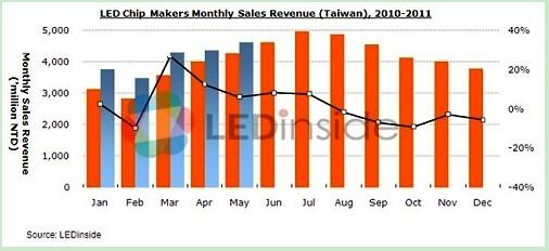 從上游芯片廠營收來看,2011年5月份臺灣上市柜LED芯片/晶粒廠營收46.25億元,與去年同期相比成長8.3%,與上月相較增加5.8%。下游LED封裝方面,5月份臺灣上市柜LED封裝廠營收達到53.32億元,與去年同期相比衰退0.8%,但較上月增加1.6%。
