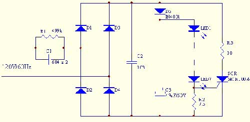 在圖二電路中﹐可控硅SCR及R3組成保護電路﹐當流過LED的電流大于設(shè)定值時﹐SCR導(dǎo)通一定的角度﹐從而對電路電流進行分流﹐使LED工作于恒流狀態(tài)﹐從而避免LED因瞬間高壓而損壞。