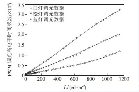 圖3為SS-230平板顯示綜合分析系統(tǒng)的照片。實驗時,調(diào)白光從低亮度到高亮度,橙燈和藍(lán)燈也按比例逐漸增加,保證色溫在(6 500±30)K,色坐標(biāo)u′=0。198,v′=0。468。記錄從低亮度到高亮度調(diào)光過程中,白燈、橙燈和藍(lán)燈的調(diào)光PWM波形高電平持續(xù)時間的數(shù)據(jù),共記錄40組數(shù)據(jù)。