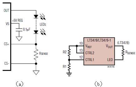調節LED的電流最簡單的方法就是改變和LED負載串聯的電流檢測電阻(圖2a),幾乎所有DC-DC恒流芯片都有一個檢測電流的接口,是檢測到的電壓和芯片內部的參考電壓比較,來控制電流的恒定。但是這個檢測電阻的值通常很小,只有零點幾歐,如果要在墻上裝一個零點幾歐的電位器來調節電流是不大可能的,因為引線電阻也會有零點幾歐了。所以有些芯片提供一個控制電壓接口,改變輸入的控制電壓就可以改變其輸出恒流值。例如凌特公司的LT3478(圖2b)只要改變R1和R2的比值,也可以改變其輸出的恒流值。