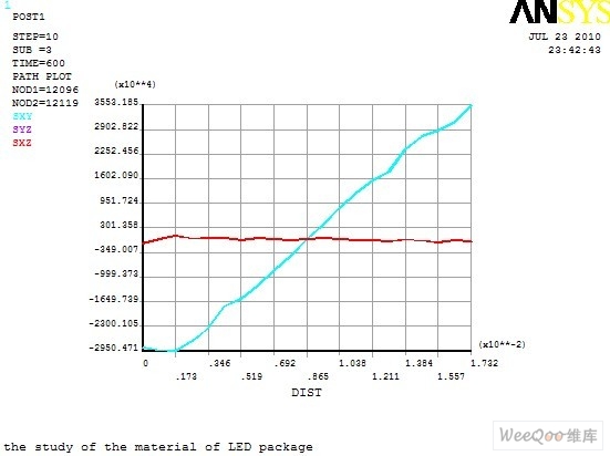 圖10 顯示了路徑上剪應(yīng)力的變化情況,SYZ 與SXZ 幾乎重合,且剪應(yīng)力很小,變化平緩;SXY 變化非常劇烈,說(shuō)明在Y 方向上,即基板與熱沉之間有較大的剪應(yīng)力,且由中間向兩端增大,表明剪應(yīng)力主要集中在邊角區(qū)域。這是由于基板與熱沉為兩種不同的材料,材料之間的熱膨脹系數(shù)及彈性模量不同而產(chǎn)生較大剪應(yīng)力。