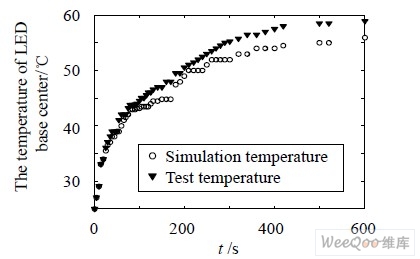 圖3 Lumileds 1W LED 基板中心點(diǎn)溫度實(shí)測(cè)數(shù)據(jù)與仿真數(shù)據(jù)對(duì)比
