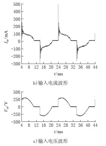 圖4a)、b)、c)為可控硅導通角為115°時阻抗匹配開關驅動電壓VZ、輸入電流Iin、輸入電壓Vin的波形,電路的輸出電流為470mA,功率因數為0.78。從圖中可看出,當可控硅導通瞬間,由于驅動器輸入端有差模濾波電容導致輸入電流有沖擊電流尖峰,而當輸入電流小于一定值時,阻抗匹配開關開通以保證流過可控硅的電流大于其維持電流。