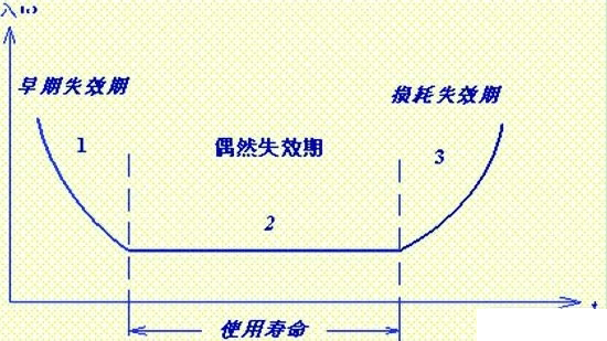 對可靠性的研究不能只停留在數據的測量和壽命的推算上,重要的是利用有效數據進行失效機理的分析。器件的失效分為早期失效,偶然失效,耗損失效三個階段,服從浴盆分布曲線。如圖1所示: