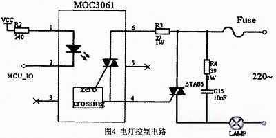 本系統由光電傳感器檢測洗手間內是否有人,單片機進行計數,當N不為零時,單片機會向與MOC3061芯片引腳相連的端口輸送信號,然后通過可控硅來控制燈的開、關。其中R3是雙向可控硅的門極電阻,當可控硅靈敏度較高時,門極阻抗也很高,并上R3可提高抗干擾能力。 39Ω電阻和0.01μF電容組成浪涌吸收電路,防止浪涌電壓損壞雙向可控硅。其電路圖如圖4所示。