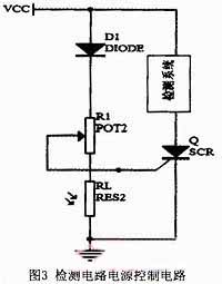 本系統中將光敏電阻與單向可控硅配合使用,組成檢測電路的啟動開關電路。其原理圖如圖3所示。