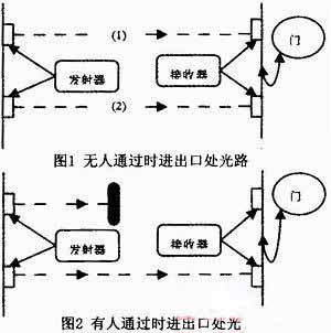 本系統中設計了兩個對射型光電傳感器,當有人通過時,若是光路(1)先檢測到信號,則表明此人是進洗手間,計數器加1,若是光路(2)先檢測到信號,則表明此人是出洗手間,計數器減1,即兩個對射型光電傳感器是用來檢測和判斷是否有人進出洗手間。