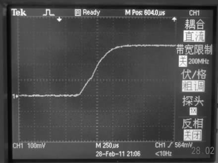 通過模擬可初步選擇40 mH 的電感作為驅動電路所用, 圖3 是用示波器采到的電壓波形圖, 此電壓是電路中串聯了一個20 Ω 的電阻上的電壓, 穩定后電壓為340 mV, 即電路中電流為17 mA.因為實際電路中電流有損耗, 所以實際電流值比模擬電流值偏小, 但整個電流的變化趨勢與模擬基本一致。
