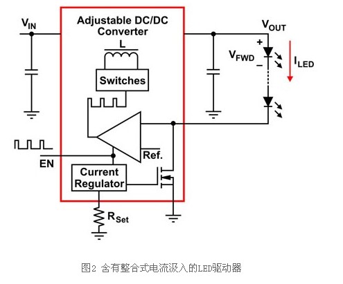WLED亮度會(huì)隨著通過的電流而呈現(xiàn)直線變化,為使得各串行達(dá)到最佳的WLED電流準(zhǔn)確度及一致性亮度,LED驅(qū)動(dòng)器應(yīng)調(diào)節(jié)通過LED的電流電壓,而非調(diào)節(jié)LED兩端的電流電壓。圖1顯示如何在輸出大于LED正向電壓的總和且電壓(VLED)下降情況下,重新設(shè)定任何可調(diào)整輸出的電流調(diào)節(jié)直流對(duì)直流(DC-DC)轉(zhuǎn)換器成為穩(wěn)定電源,以驅(qū)動(dòng)串聯(lián)的多顆WLED。