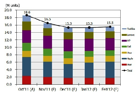 可攜式個人電腦品牌各月出貨預測數(shù)量 (單位:百萬臺)