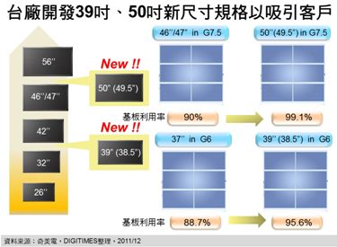 在此一情景下,開發(fā)新的尺寸以增加面板或液晶電視的銷售單價(jià),并凸顯比競爭廠商產(chǎn)品的屏幕更多幾公分,便成為2012年面板或彩電廠商提升平均單價(jià)及在市場上脫穎而出的重要發(fā)展方向。