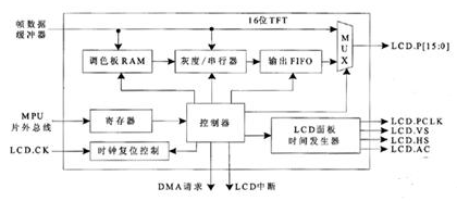 LCD控制模塊的數據通道由調色板RAM、灰度/串行器和輸出FIFO這3個部分組成。這3個部分支持12或16位STN方式,由控制器控制輸出數據到LCD的數據總線上。而對于16位薄膜工藝學(TFT,Thin ̄Film Technology)方式,數據直接傳輸到LCD的總線,提供2(16)=64K的彩色信號。