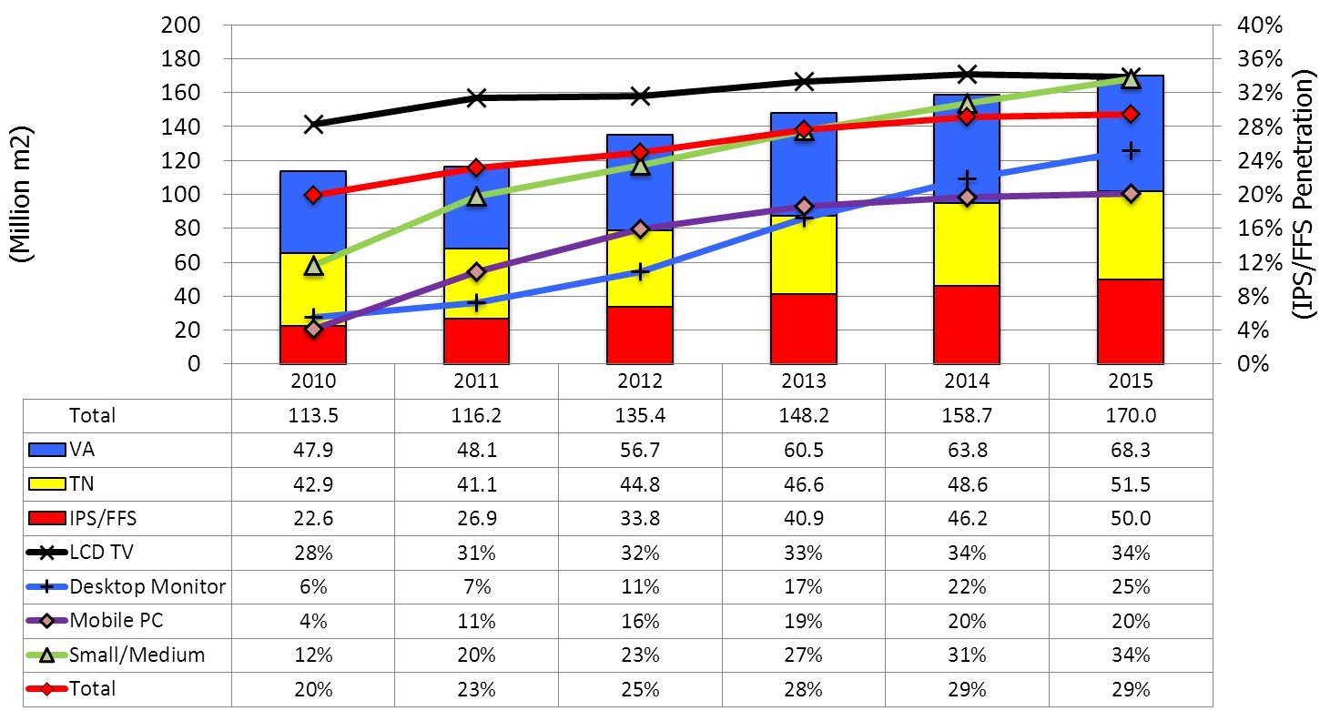 在液晶電視市場,廣視角一直是主要的賣點之一,其中IPS/FFS LCD面板的滲透率在2011年達到31%。在桌上型顯示器市場, IPS/FFS 面板傅統(tǒng)上被用在一些特殊應用,例如醫(yī)療設備,2011年滲透率為7%,而NPD DisplaySearch預測這個數(shù)字在2015年將上升到25%,主因于IPS面板的領導生產(chǎn)商LG Display計劃使IPS成為桌上型顯示器面板的標準。