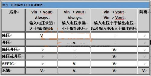 表1的信息可供作選擇LED驅(qū)動(dòng)器最佳切換拓?fù)涞膮⒖?。除了這些拓?fù)渲?,也可以使用簡單的電流限制電阻或是線性穩(wěn)壓器,不過這些方法通常會(huì)耗用過多功率。輸入電壓范圍、驅(qū)動(dòng)的LED數(shù)目、LED電流、隔離、電磁干擾(EMI)限制以及效能,都是相關(guān)的設(shè)計(jì)參數(shù)。大部分的LED驅(qū)動(dòng)電路可分為以下幾種拓?fù)漕悇e:降壓、升壓、降壓升壓、SEPIC以及返馳。