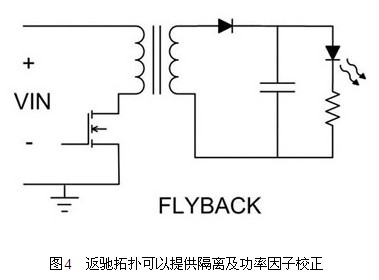 基于安全考慮,可能會(huì)規(guī)定在脫機(jī)電壓及輸出電壓之間進(jìn)行隔離。此應(yīng)用方式下,最節(jié)省成本的解決方法就是使用返馳轉(zhuǎn)換器(圖4),在所有的隔離拓?fù)渲校@種作法所需要的組件數(shù)量最少。變壓器匝數(shù)比可用來對輸出電壓進(jìn)行降壓、升壓或降壓升壓,設(shè)計(jì)彈性很大,不過缺點(diǎn)在于電源變壓器基本上是訂制組件。此外,在FET以及輸入和輸出電容器中,也會(huì)有高組件應(yīng)力的情形出現(xiàn)。應(yīng)用固定燈光時(shí),可以使用「慢速」的回饋控制循環(huán),調(diào)節(jié)LED電流與輸入電壓同相位的情形,進(jìn)行功率因子校正(PFC)。這樣可以調(diào)節(jié)所需的平均LED電流,并能調(diào)節(jié)輸入電流與輸入電壓同相位的情形,以提供高功率因子。