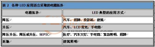 如同表2所示,LED已廣泛運(yùn)用于各領(lǐng)域,因此需要許多種類的電源拓?fù)?,支持LED的應(yīng)用。一般而言,必須考慮輸入電壓、輸出電壓及對隔離的需求,以做出適當(dāng)選擇。
