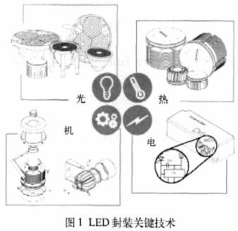 LED 的封裝技術(shù)實(shí)際上是借鑒了傳統(tǒng)的微電子封裝技術(shù),但LED 有其獨(dú)特之處,又不能完全按照微電子封裝去做。整個(gè)LED 封裝工藝主要包括封裝原料的選取、封裝結(jié)構(gòu)的設(shè)計(jì)、封裝工藝的控制以及光學(xué)設(shè)計(jì)與散熱設(shè)計(jì),概括來(lái)講就是熱- 電- 機(jī)-光(T.E.M.O.),如圖1 所示,這是LED封裝的關(guān)鍵技術(shù)。