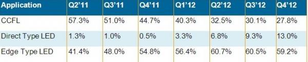 表二 、Q2’11~Q4’12不同背光源的液晶電視面板出貨比重