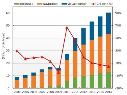 平板顯示器于車載的應(yīng)用已經(jīng)越來越盛行,如汽車導(dǎo)航、多功能駕駛儀表盤、以及后座娛樂顯示屏幕等。NPD DisplaySearch預(yù)測應(yīng)用于車載的面板出貨量將有望從2011年的4千2百萬片成長到2015年的6千2百萬片。