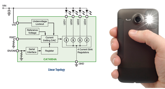 LED越來越多地應用于拍照手機、智能手機和氙氣燈泡替代,且光輸出能力不斷提供,從而滿足更高的性能需求。安森美半導體的CAT3612、CAT4131、CAT4134和CAT3224都是這類驅動方案。這些器件分別采用電荷泵、電感升壓拓撲結構,可以提供不同的閃光電流和亮度。