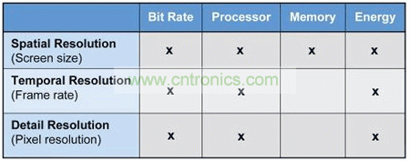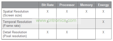 表 1 給出了不同視頻編碼參數對解碼設備所需資源選擇的大致影響。該表專門對采用運動補償與離散余弦變換 (DCT) 技術實現視頻壓縮的基于塊的視頻編解碼器進行了分析。