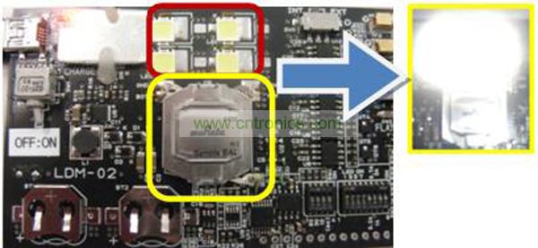 圖2中EDLC作為輔助電源,顯示了8A的電流流入LED時(shí)的數(shù)據(jù)。得出的結(jié)果是超過了1,000lux的亮度。