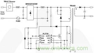 這一架構現在已經用于兩款新的PWM控制器,即可調光 FL7730 PWM 控制器和非調光 FL7732 PWM 控制器。圖2是簡化的應用原理圖,顯示用于TRIAC調光的FL7730器件。