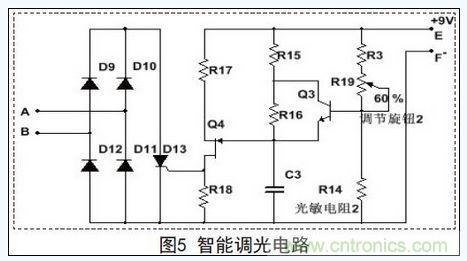 當LED照明設備開始工作后,本文設計的智能開關會依據環境照明情況的變化,通過智能調光電路自動地改變照明設備的亮度。圖1所示的智能調光電路接口A、B接入的電路如圖5所示。