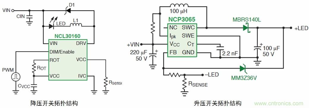 用于中等電壓通用照明的開(kāi)關(guān)驅(qū)動(dòng)器有多種拓?fù)洌缃祲骸⑸龎海唤祲?升壓的NCP3065和NCP3066(可以配置為控制器)、NCP3163、MC33163、NCP1294;降壓的CAT4201、NCP1034、NCL30100、NCL30105、NCL30160、NCL30161;此外還有升壓或SEPIC的CS5171/3。