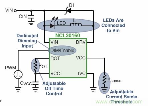 大功率LED可采用安森美半導(dǎo)體的恒流降壓LED驅(qū)動(dòng)器NCL30160,實(shí)現(xiàn)高達(dá)98%的能效。它采用30 mΩ集成MOSFET,100%占空比可提供高能效;輸入電壓范圍為6.3 V至40 V,開(kāi)關(guān)頻率可達(dá)1.4 MHz;還具有專用PWM調(diào)光引腳/低功率關(guān)閉、無(wú)須控制環(huán)路補(bǔ)償和1.5 A平均電流能力。