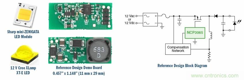 對(duì)于3至4個(gè)LED模塊的12 V AC-DC設(shè)計(jì),可以使用安森美半導(dǎo)體針對(duì)NCP3065的評(píng)估板NCP3065BBGEVB,用來(lái)驅(qū)動(dòng)12 Vac/Vdc應(yīng)用中的夏普Z(yǔ)ENIGATA™、Cree XLamp™MC-E及其他LED模塊。其特點(diǎn)是小尺寸、寬輸入和輸出工作電壓,輸出電流經(jīng)過(guò)穩(wěn)流,還具有LED開(kāi)路保護(hù)、輸出短路保護(hù)能力。該解決方案適用于MR16燈泡、景觀照明、交通照明。