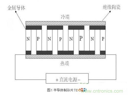半導體制冷又稱電子制冷,或者溫差電制冷,是從50年代發(fā)展起來的一門介于制冷技術和半導體技術邊緣的學科,與壓縮式制冷和吸收式制冷并稱為世界三大制冷方式。半導體制冷器的基本器件是熱電偶對,即把一只N型半導體和一只P型半導體連接成熱電偶(如圖1),通上直流電后,在接口處就會產生溫差和熱量的轉移。在電路上串聯(lián)起若干對半導體熱電偶對,而傳熱方面是并聯(lián)的,這樣就構成了一個常見的制冷熱電堆。借助于熱交換器等各種傳熱手段,是熱電堆的熱端不斷散熱并且保持一定的溫度,而把熱電堆的冷端放到工作環(huán)境中去吸熱降溫,這就是半導體制冷的原理。