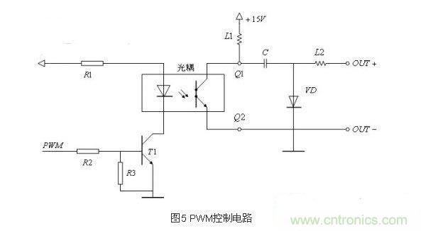 限于篇幅有限,下面僅對此PWM控制電路進行簡單的介紹:當PWM控制信號為低電平時,晶體管T1處于截止狀態(tài),光電耦合器中發(fā)光二極管的電流近似為零,輸出端Q1和Q2間的電阻很大,相當于開關“斷開”;當PWM波控制信號為高電平時,晶體管T1處于導通狀態(tài),光電耦合器中發(fā)光二極管發(fā)光,輸出端Q1和Q2間的電阻很小,相當于開關“導通”.由上面介紹可知,當DS18B20采集的實時溫度小于制冷啟動溫度時,光電耦合器的PWM輸入端無信號輸入時,光電耦合器處于不工作狀態(tài),圖5中的OUT+端和OUT-端無輸出電壓,即半導體制冷片處于閑置狀態(tài);當DS18B20采集的實時溫度大于制冷啟動溫度時,光電耦合器的PWM輸入端有信號輸入,圖5中的OUT+端和OUT-端即有輸出電壓。通過PWM調制波控制Q1和Q2兩端的通斷,即可實現(xiàn)對半導體制冷片TEC工作電壓的控制,進而控制了半導體制冷片TEC的散熱功率。圖5中的OUT+端和OUT-端分別接在半導體制冷片TEC的輸入端線上。根據(jù)CUK電路的輸出電壓和供電電源電壓的關系,可得出PWM波占空比和半導體制冷片TEC輸入電壓的關系: