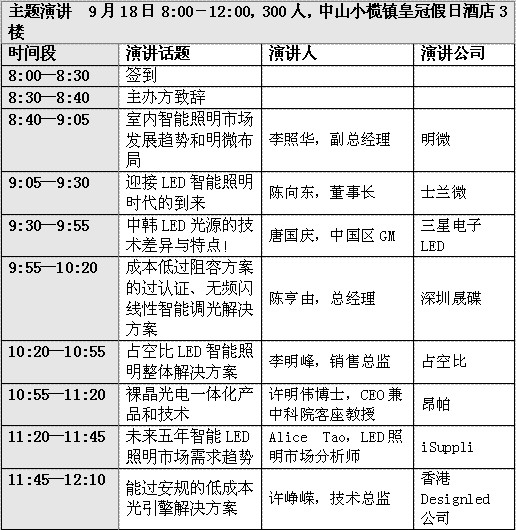 演講主題有:未來五年智能LED照明市場需求趨勢、當前LED燈具制造商面臨的四大發展陷阱、明微在智能調光市場布局和現有解決方案、占空比智能LED照明整體解決方案、成本低于阻容方案的線性恒流方案、崛起中的數字有線智能LED調光解決方案、外圍只需一個橋堆芯片的高集成度過安規光引擎解決方案、無頻閃低成本智能LED調光線性恒流方案、光引擎的技術發展和市場需求趨勢、中韓LED光源的技術差異和購買指南、目前LED驅動電源技術開發和市場需求趨勢、低成本動態LED景觀照明解決方案和依托臨江開發中國東部沿海LED照明市場。[page]