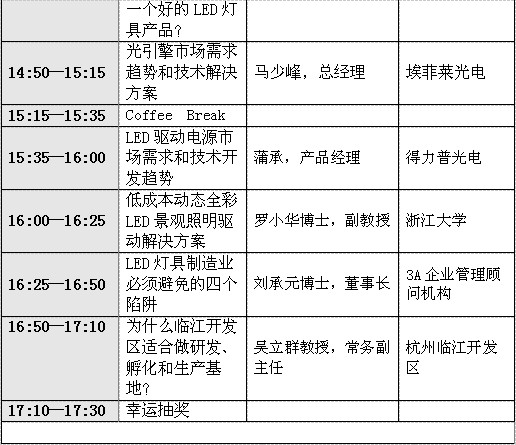到目前為止,已邀請到的演講嘉賓包括:明微副總經理李照華、占空比銷售總監李明峰、昂帕CEO許明偉博士、士蘭微董事長陳向東、DesignLed技術總監許崢嶸、晟碟總經理陳亨由、埃菲萊總經理馬少峰、三星LED總經理唐國慶、飛泰科技董事長董沛、iSuppli LED照明市場分析師Alice Tao、3A企業管理顧問機構董事長劉承元博士、德力普產品經理蒲承、浙江大學羅小華教授、杭州臨江高新開發區常務副主任吳立群教授。