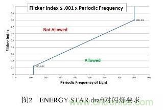 化,人眼到人腦對這一變化產(chǎn)生的主觀反映。通常閃爍按人的感覺分為可見閃爍和不可見閃爍。頻率大于100Hz時,人眼感受不到閃爍現(xiàn)象,但仍會造成眼睛疲勞,頭痛等,這就是頻閃效應。普遍認為500Hz以內都存在該效應。對此,美國能源之星在調光性能的要求中規(guī)定了閃爍需滿足的條件,使用于所有燈具。如下圖所示: