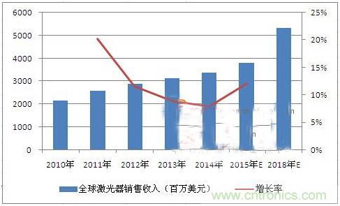 2012年,激光器從科學(xué)創(chuàng)新到工業(yè)"工具"取得進(jìn)展,并認(rèn)為現(xiàn)在是時(shí)候考慮開(kāi)拓一些新型應(yīng)用領(lǐng)域了,這些新興領(lǐng)域可能改善激光器市場(chǎng)長(zhǎng)久以來(lái)"緩慢而穩(wěn)定"的5%--6%年復(fù)合平均增長(zhǎng)率(CAGR),使其以兩位數(shù)速度增長(zhǎng)。