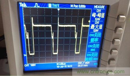 7、在輸入AC265V時實際測量開關管DS極之間最高峰值電壓有524V,而開關管DS極之間的距離僅有0.67mm,安全距離明顯不夠,因此很容易造成炸機現象,特別是在助焊劑不純的情況下,DS極之間會形成一個電阻,那就更加容易出現炸機現象。改善對策是重新修改PCB將開關管的引腳改為品字形設計,加大安全距離。