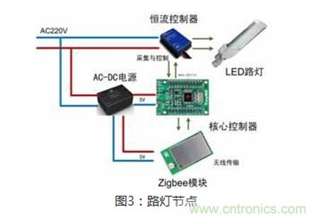 傳感器和LED燈組成。每個(gè)節(jié)點(diǎn)通過ZigBee接收命令,并實(shí)時(shí)匯報(bào)每盞路燈的亮、滅情況、實(shí)現(xiàn)亮度調(diào)節(jié)、傳送電能負(fù)荷狀態(tài)、完成燈桿損壞報(bào)警與漏電報(bào)警、接收來自ZigBee集中器的查詢命令、控制命令等。