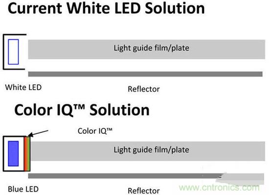前文所述量子點發光原理中提過,不同尺寸的量子點能發出不同顏色的光,這種方案中用到的的量子點就能發出紅光和綠光,這兩種尺寸的量子點借由藍色LED激發發光后,三者共同發出純度更高的白光(QD Vision主導)。這種方案的成本相對更低,由于側光式LED背光的特性,所用量子點也并不多。